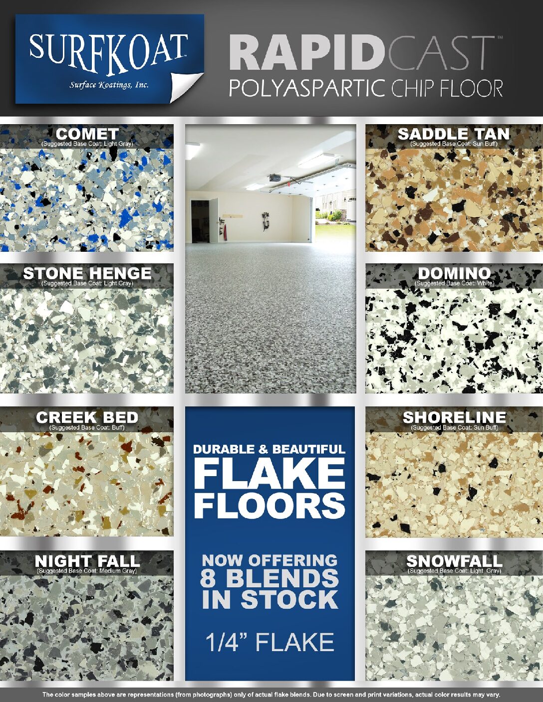 Flakes, also known as decorative vinyl color chips, flakes or fleck are specially formulated paint aggregates used to enhance the aesthetic qualities of seamless, resin based chip/flake flooring systems. This unique product is random in shape, sized within a standardized range and custom blended to match any décor.